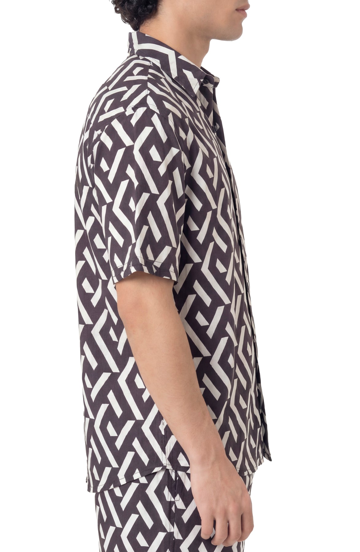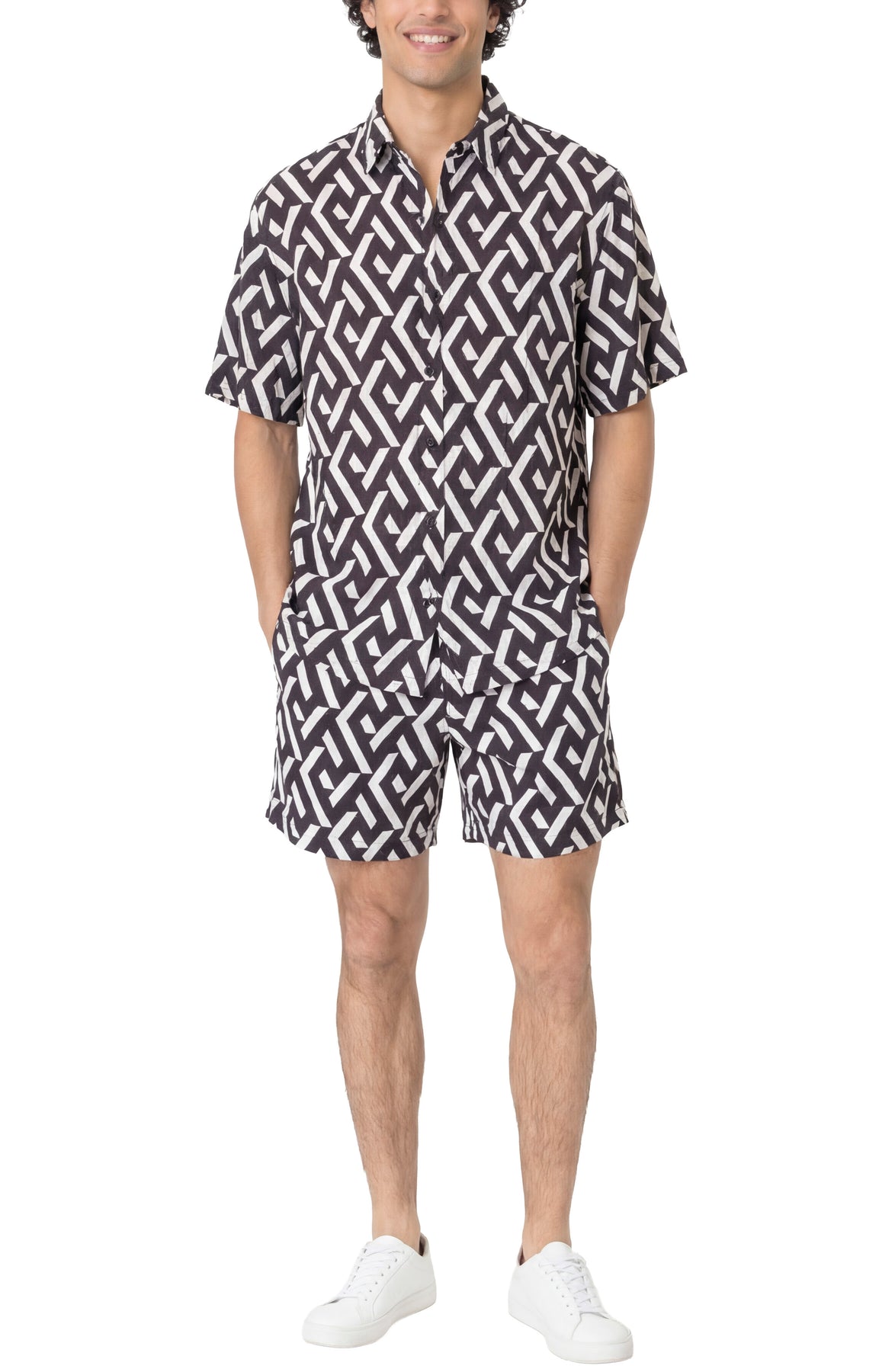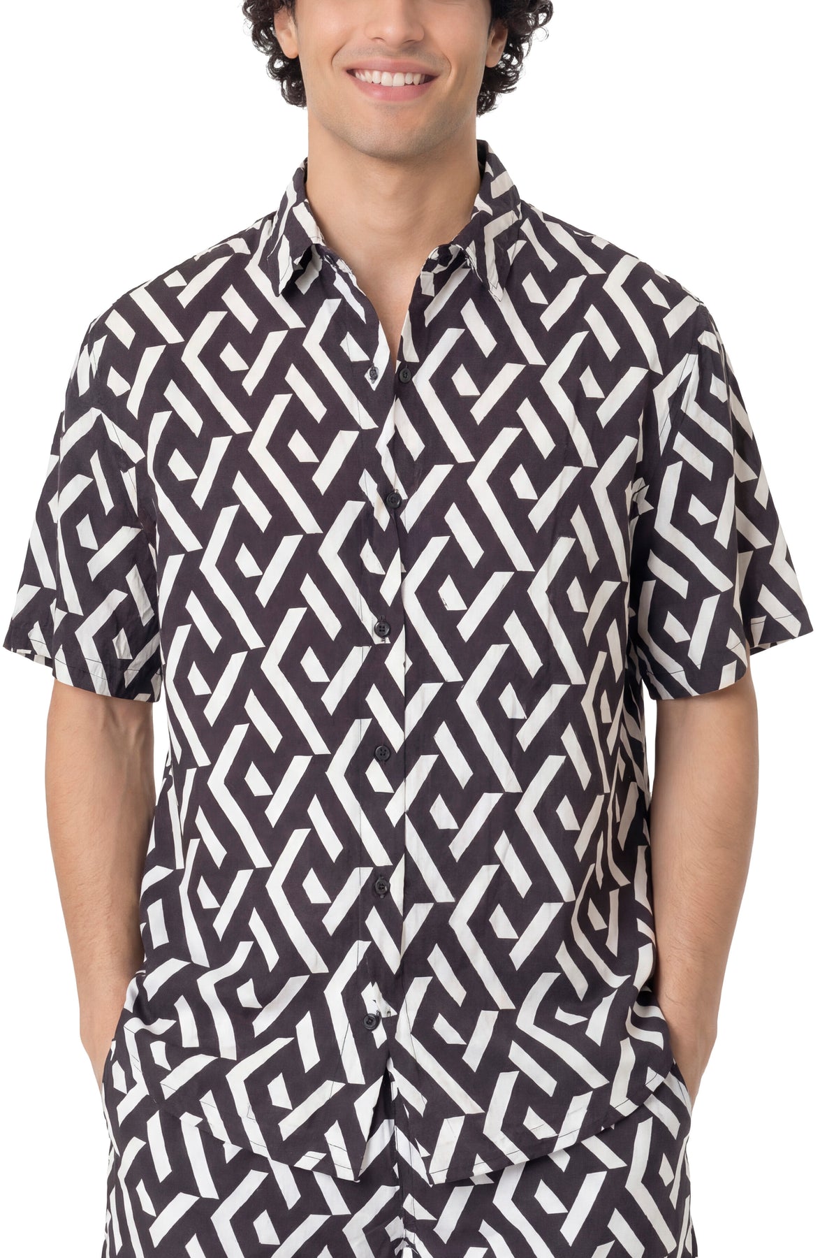 The Chester button down is made in a lightweight rayon with a soft, breathable feel and fluid drape. Relaxed, modern button-down cut with a classic collar and short sleeves for effortless layering. A bold black-and-white pattern adds graphic interest while maintaining a clean, versatile silhouette.