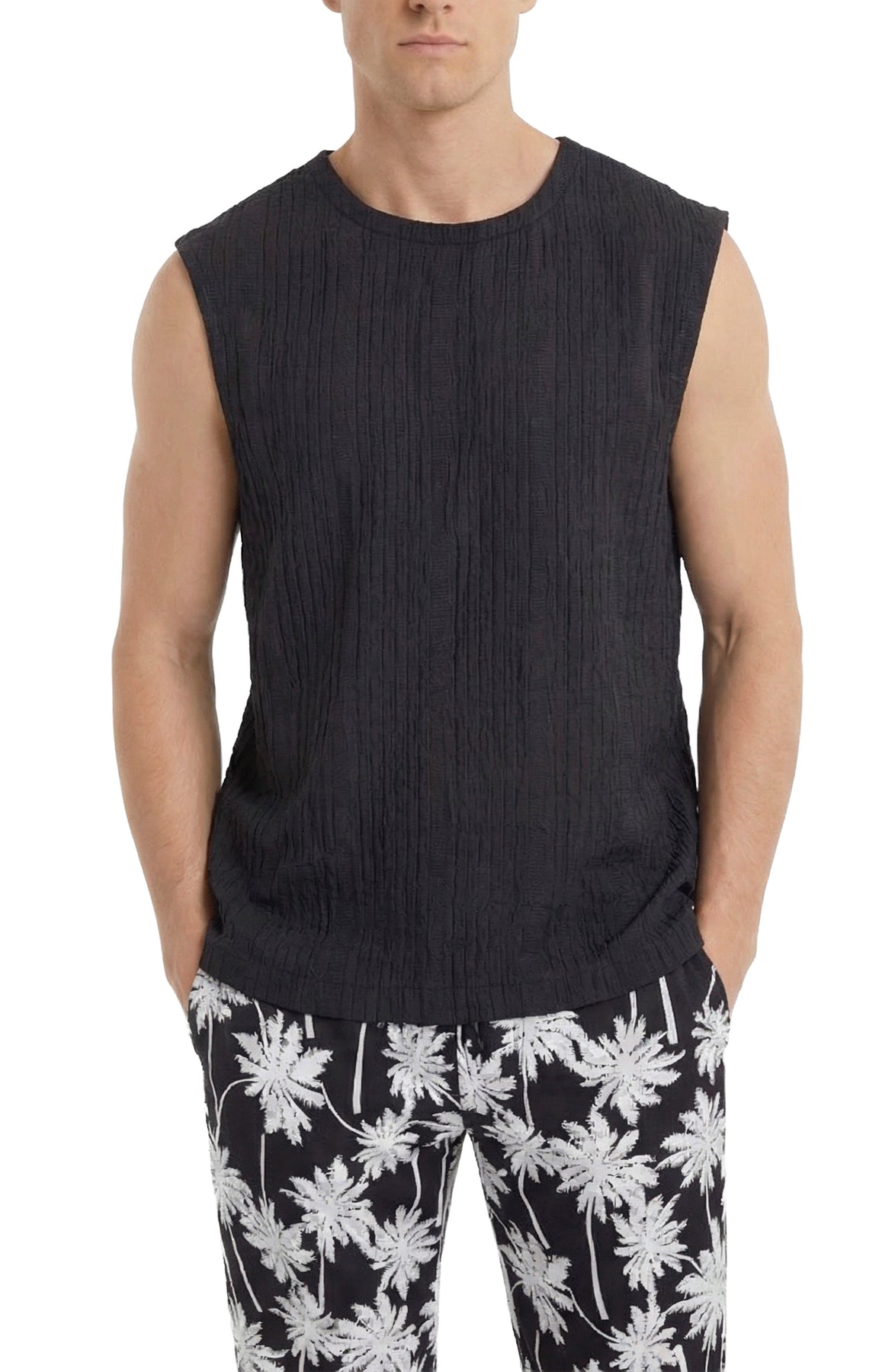 Make a statement in this men's sleeveless shirt: a bold black base contrasted by a crisp white palm print for a modern, tropical edge. Pair with swim trunks or printed shorts for a coordinated beach look, or with chinos and sneakers for warm-weather street style.