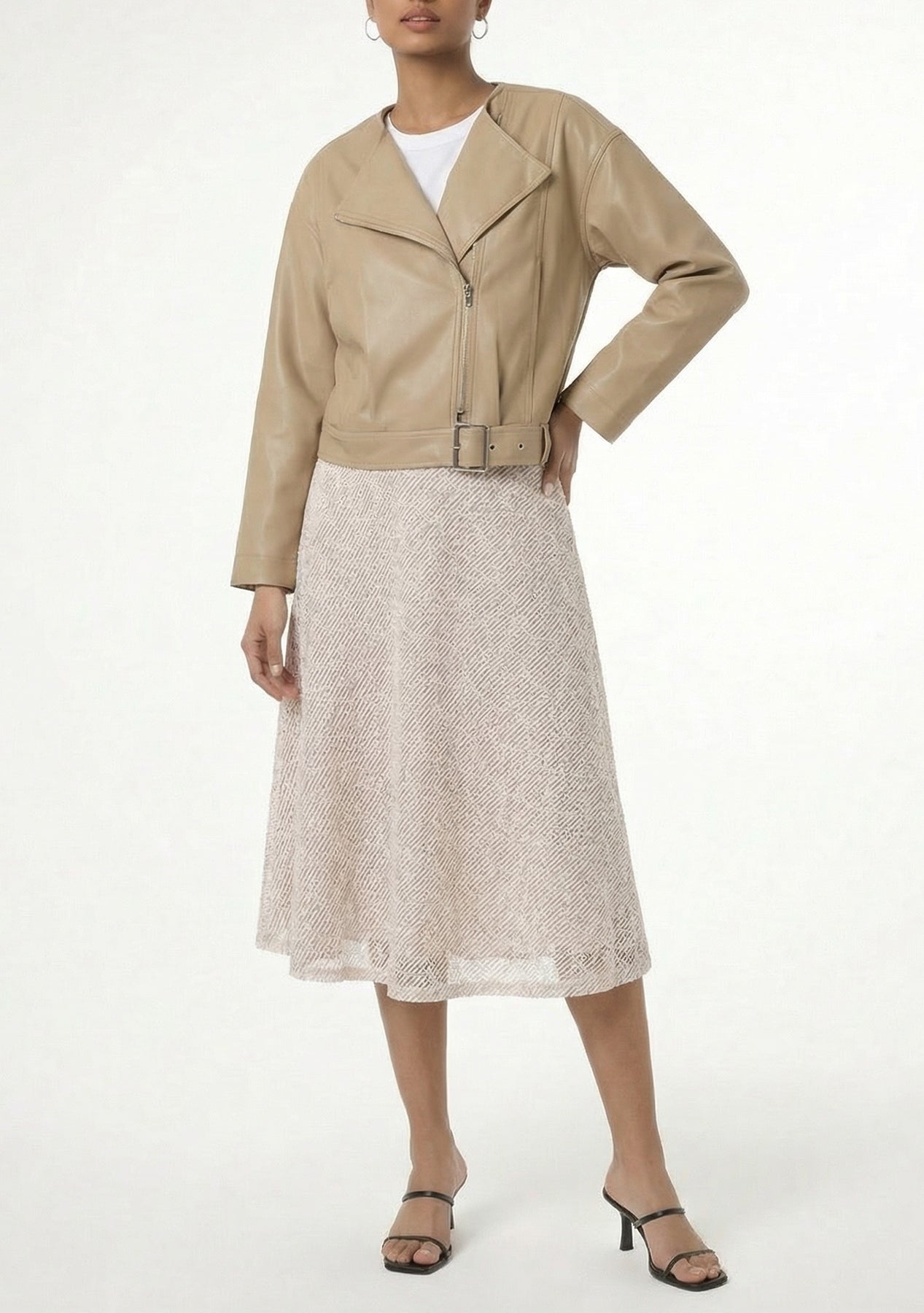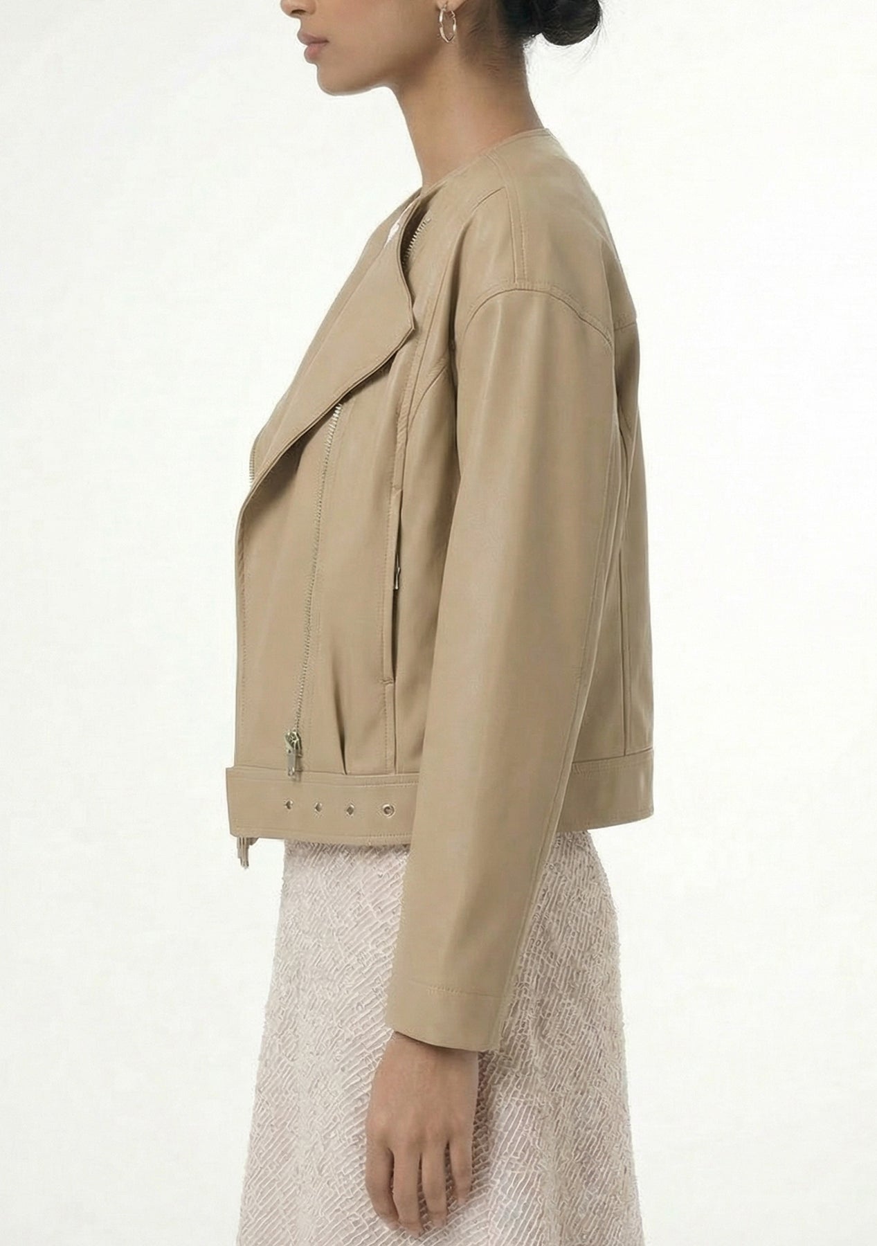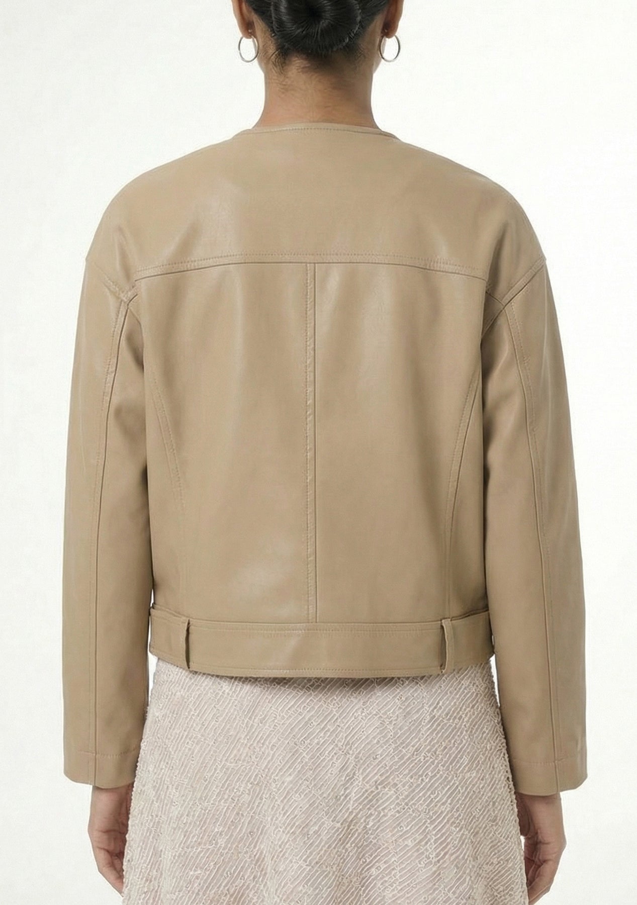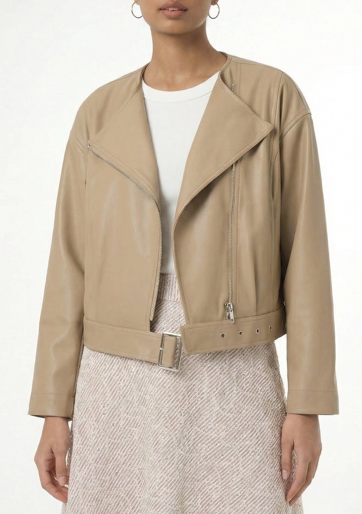 Fara — a bold faux-leather jacket with modern edge. Cropped to the waist for a flattering, contemporary silhouette, Fara features an off-center zipper for asymmetrical attitude and a hardware waist buckle that adds structure and rocker-chic detail. Smooth, high-shine faux leather and tailored seams give it polish while the cropped length pairs perfectly with high-waist jeans, skirts, or dresses for instant attitude.