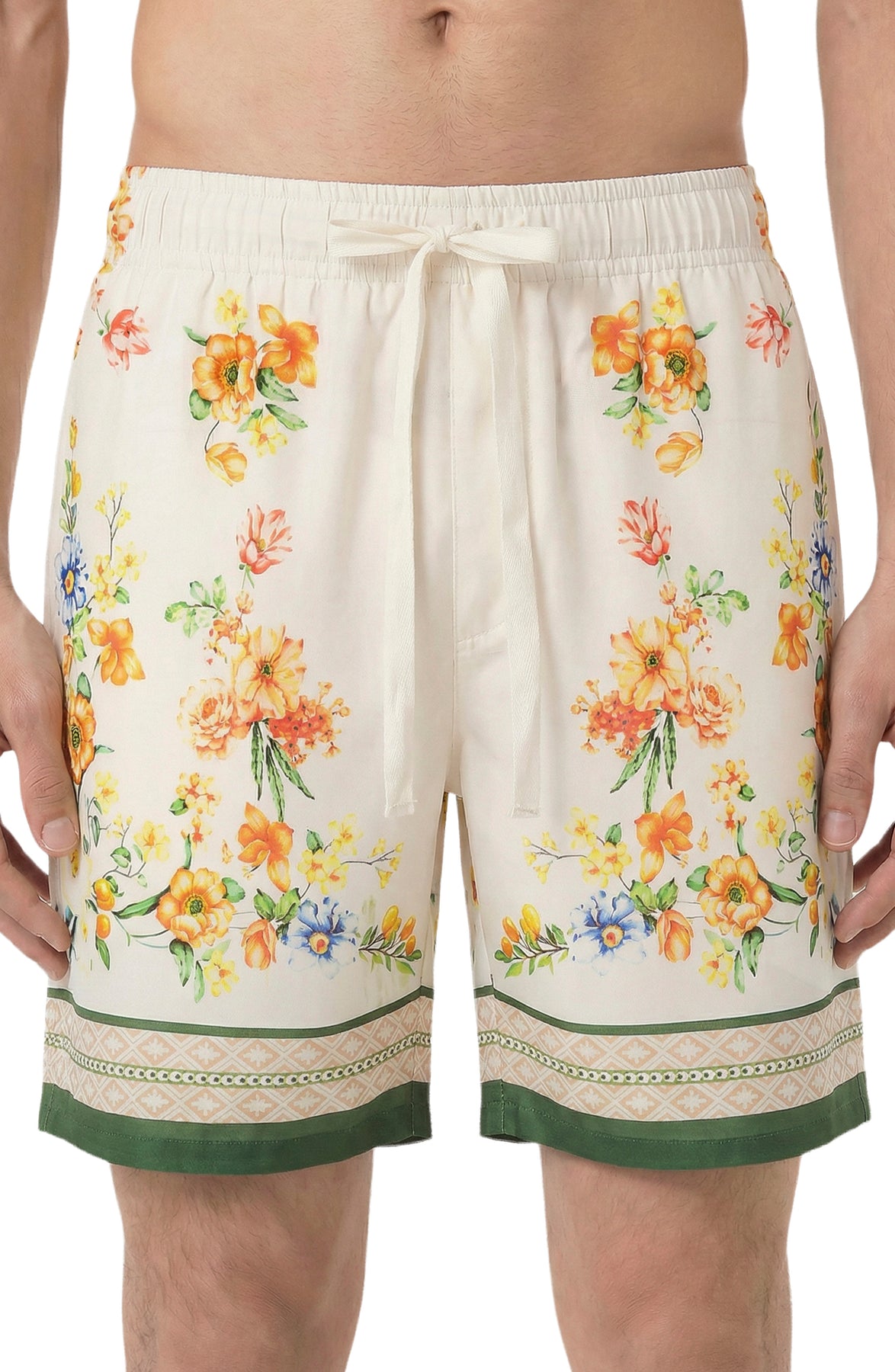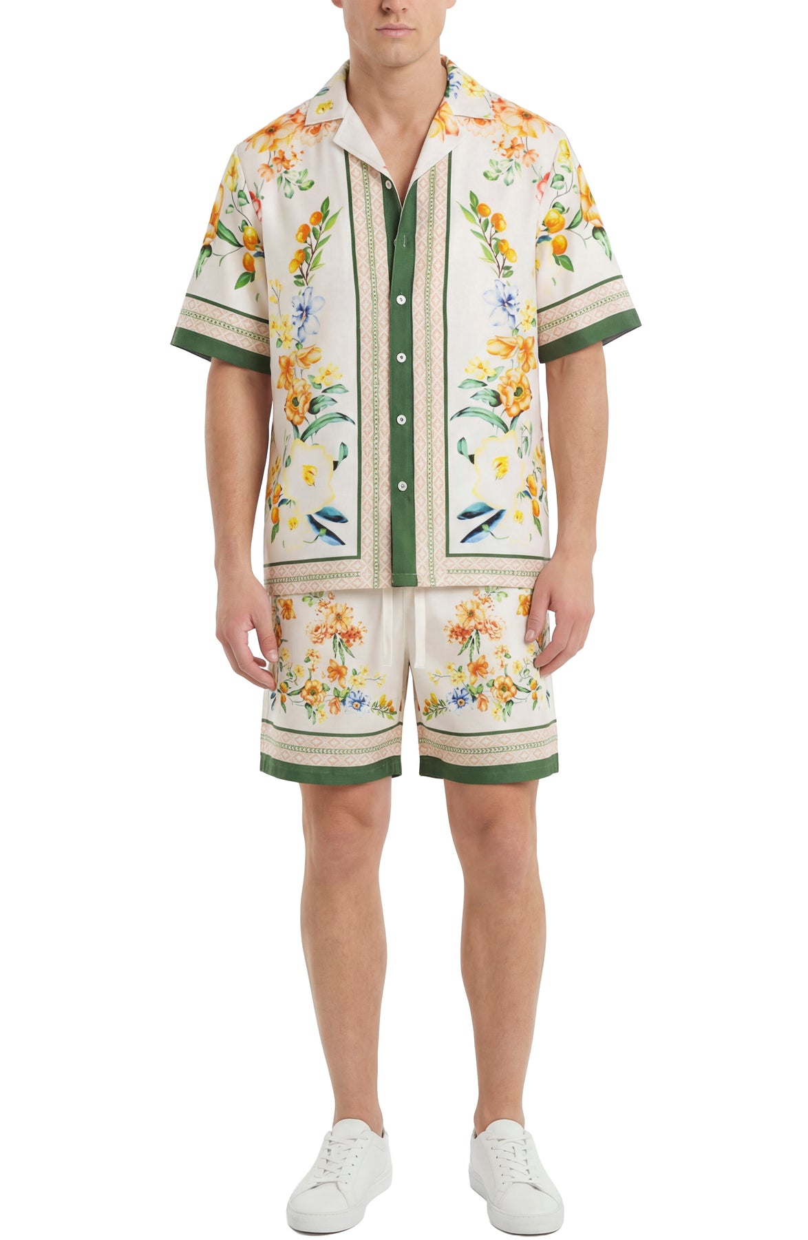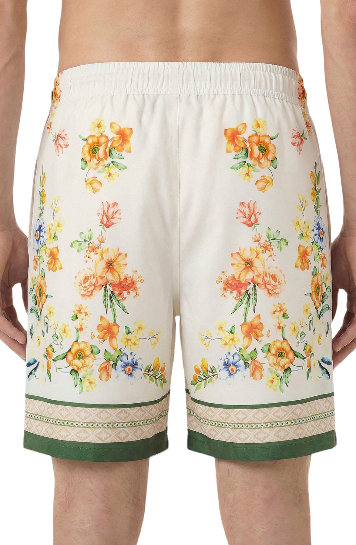 Brighten your warm-weather wardrobe with these men's shorts featuring a vibrant tropical fruit print on a clean white background, finished with a crisp green border for a fresh, modern edge.