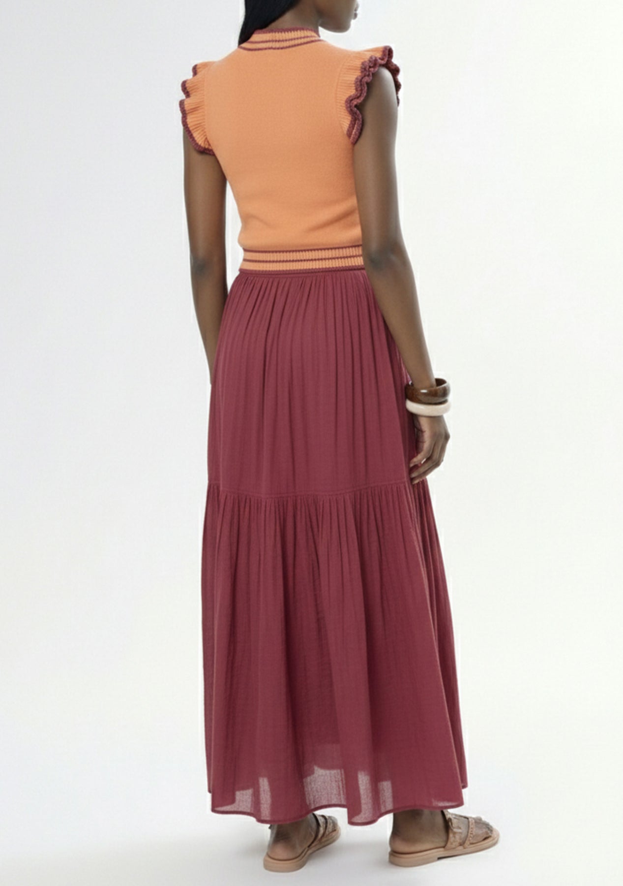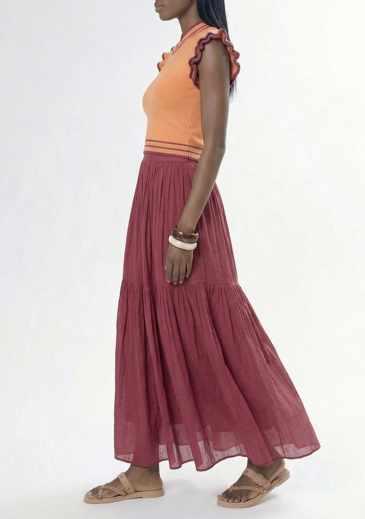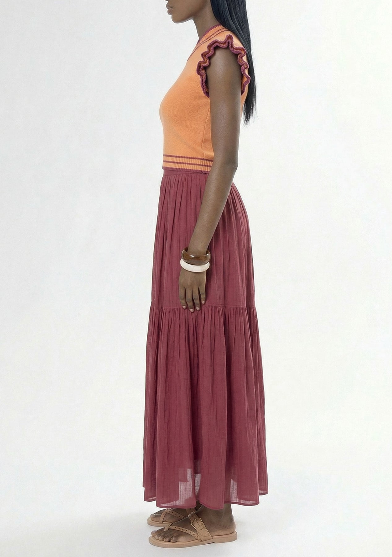 Meet the Pintuck Maxi Skirt—elegant movement, timeless detail. Delicate vertical pintucks elongate the silhouette, while a fluid drape glides with every step.