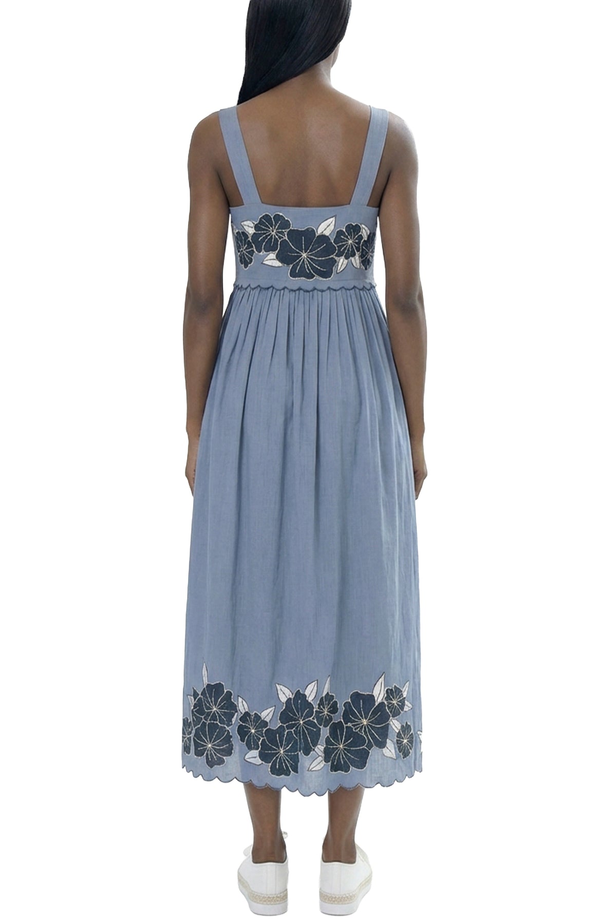 Meet the Sindhu Dress—breezy, feminine, and endlessly wearable. Soft chambray sets a relaxed tone, while floral detailing at the bust and hem adds a romantic touch.
