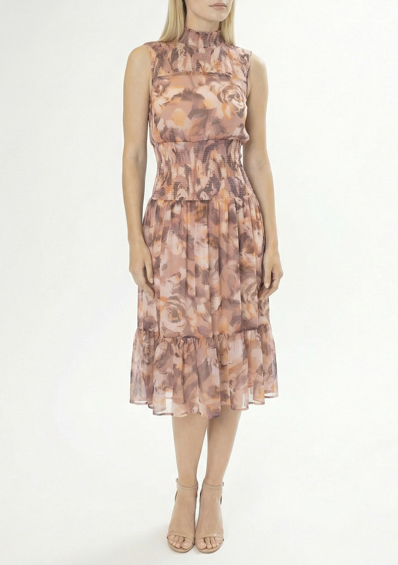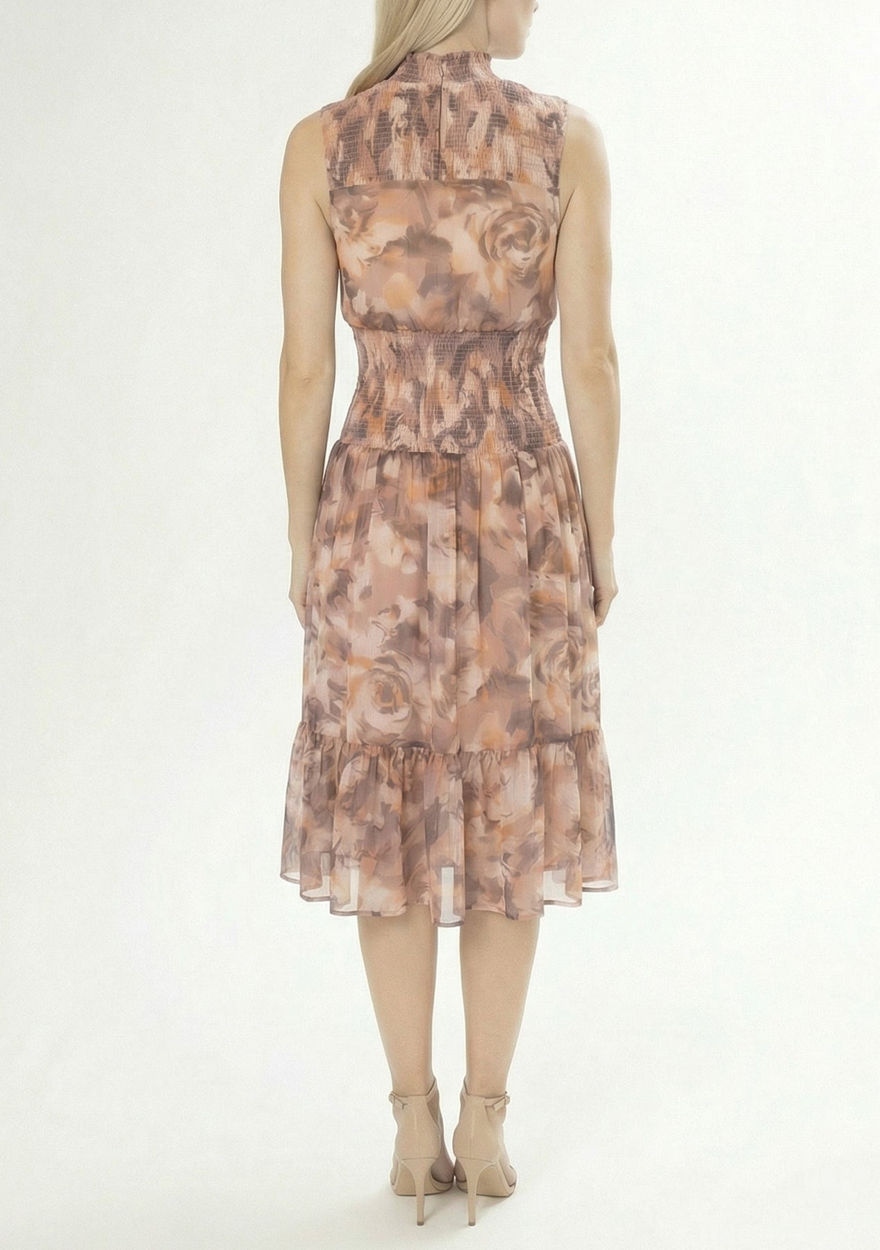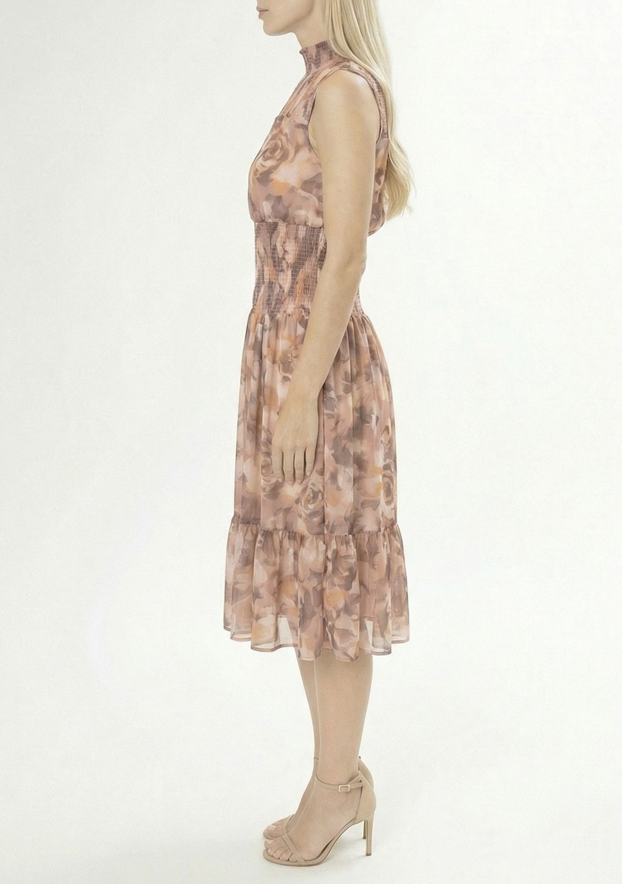 Effortless romance: a sleeveless midi dress in a soft, subtle rose print that feels elegant and wearable. Gentle ruching sculpts the waist and flatters the silhouette, while the midi length creates a timeless, versatile look you can dress up or down. Lightweight and comfortable, it’s perfect for garden parties, weekend brunches, or a polished everyday outfit—pair with sandals for daytime ease or heels and a clutch for evening.