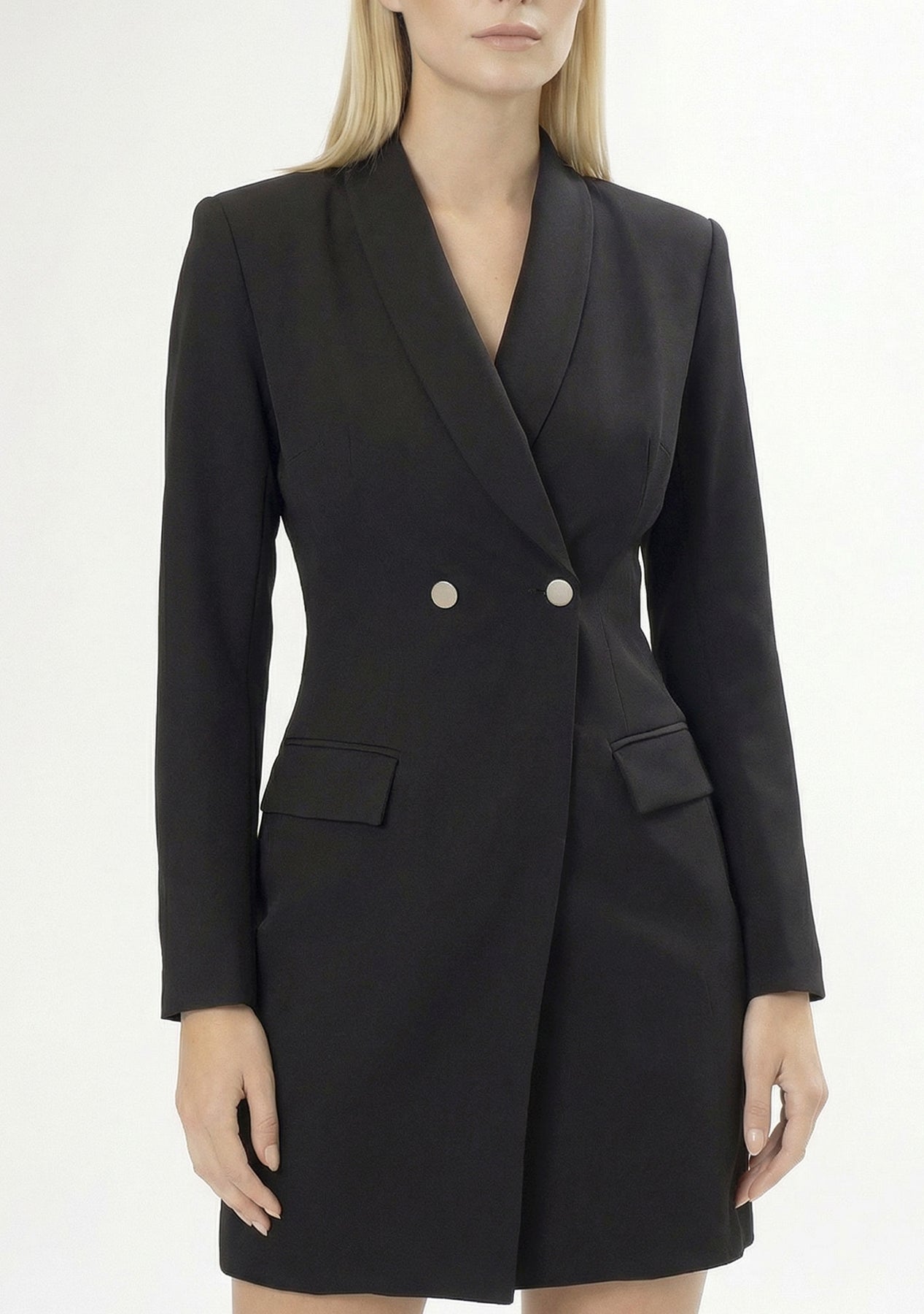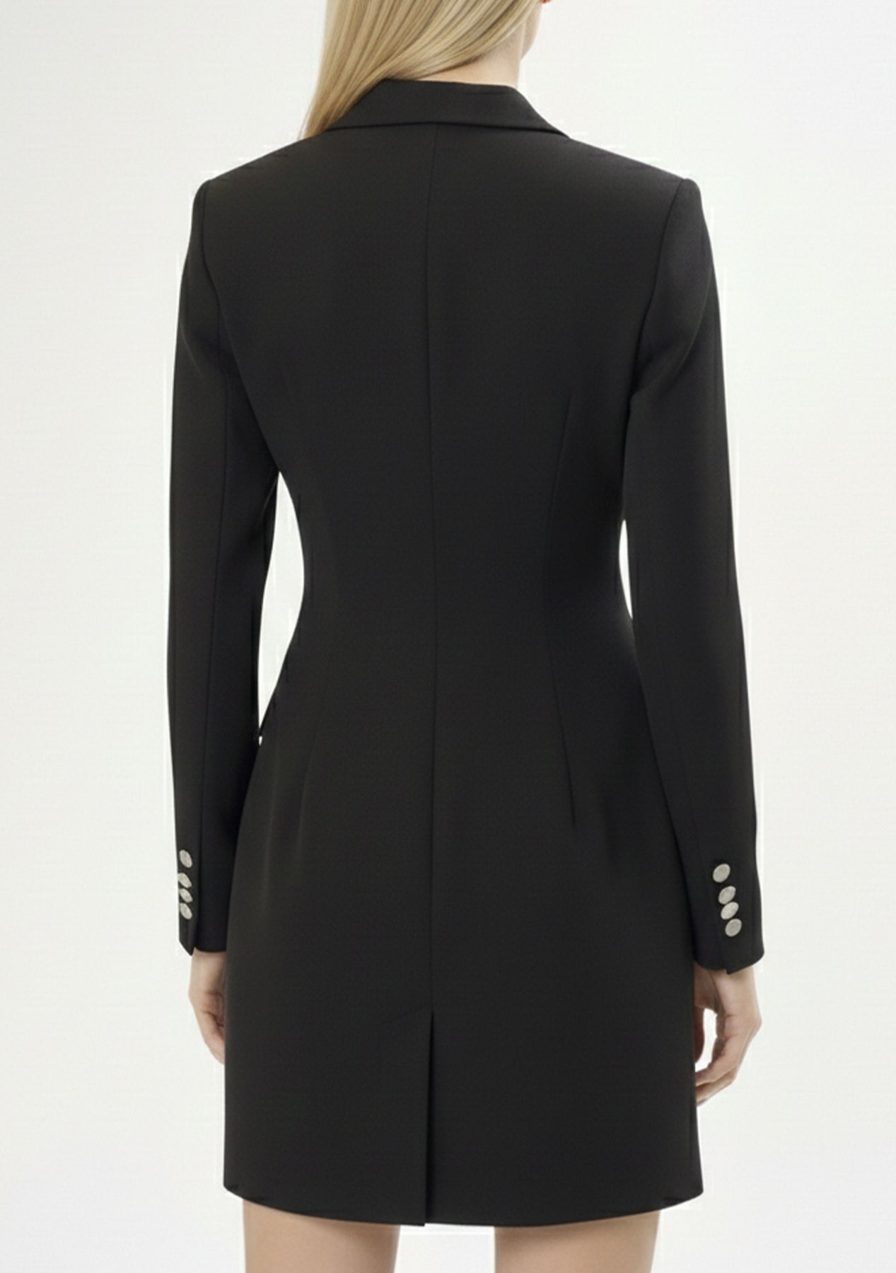 Tailored confidence meets feminine polish in this blazer-style dress. Cut in a sleek, knee-length silhouette, it features a deep V-neck that creates an elegant, elongating line and long sleeves for refined coverage. Structured lapels and sharp seaming give the look classic suiting detail, while functional pocket accents add practical polish. Wear it solo with heels for a powerful office statement or layered with tights and boots for a modern evening look.