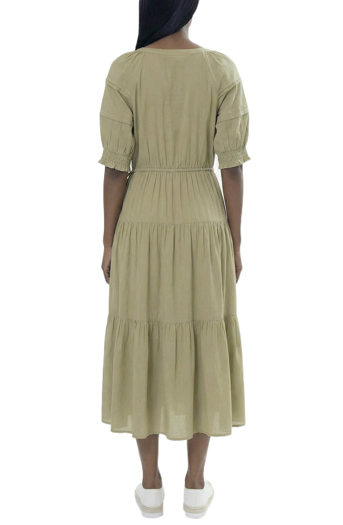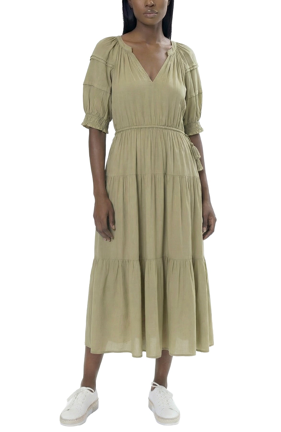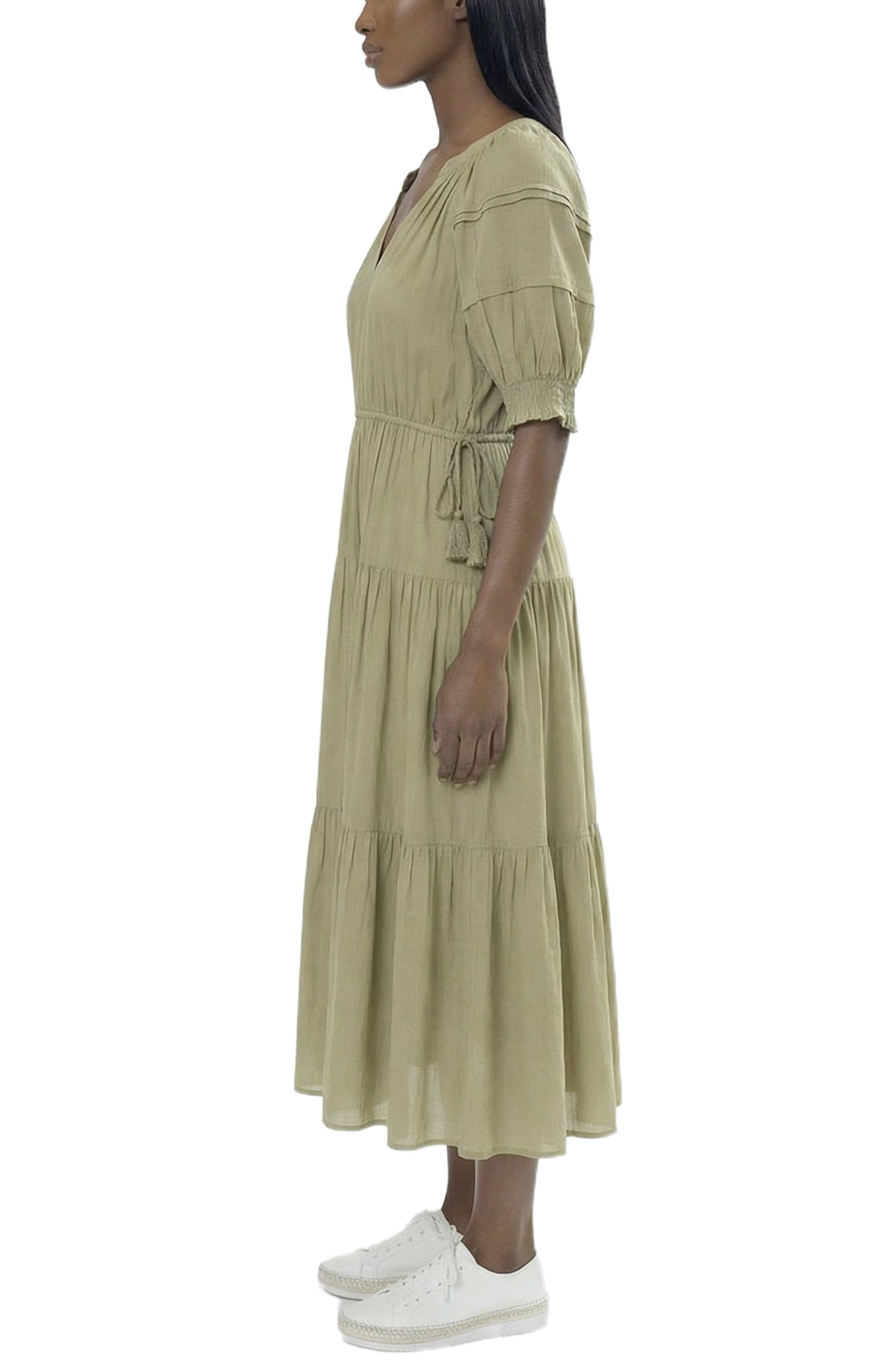 Chic and versatile, this green midi dress features a flattering V-neck, side tie and comfortable short sleeves for an effortless, polished look. The mid-calf length and gently tailored waist create a feminine silhouette that transitions easily from daytime to evening.