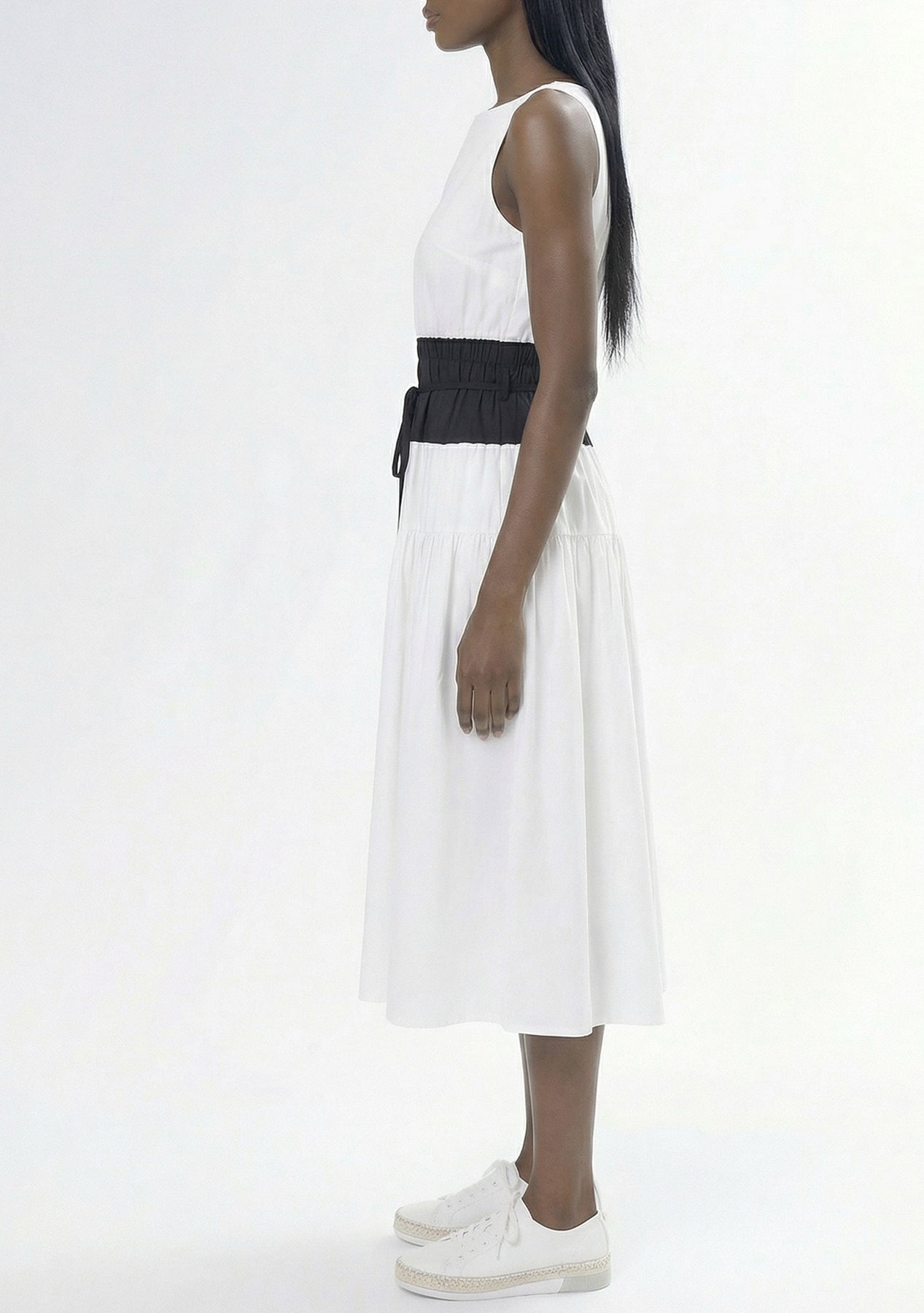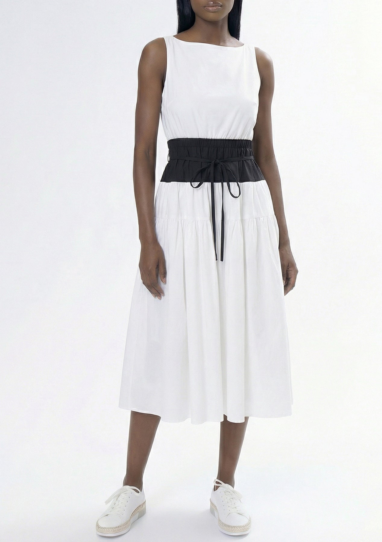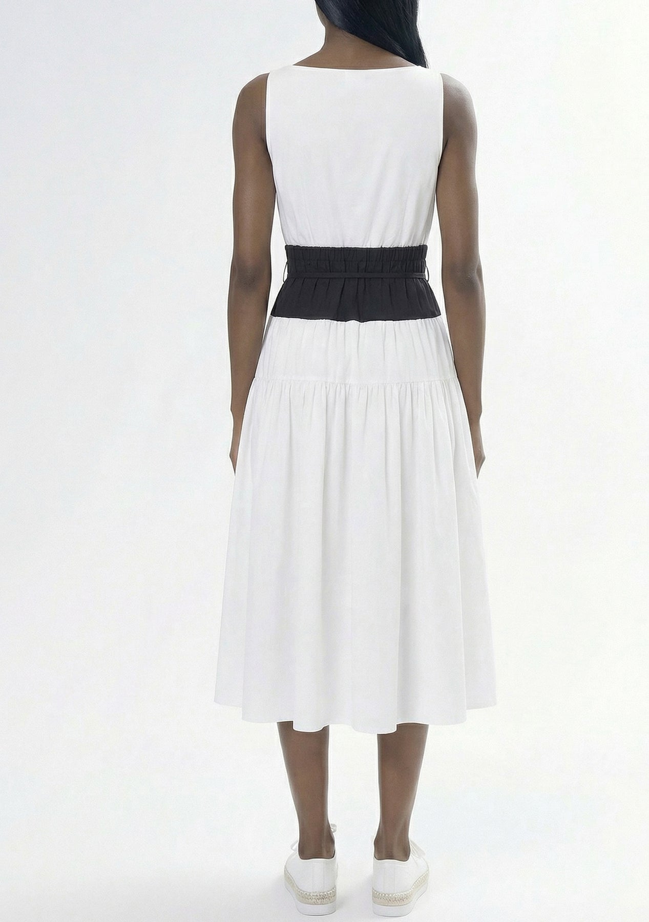 Effortlessly chic, this midi-length white dress pairs lightweight cotton with a bold contrast waist that flatters every figure. The tailored bodice flows into a softly draped skirt, while the contrast waist creates instant definition—cinching the silhouette to highlight the narrowest part of your torso for a polished hourglass look.