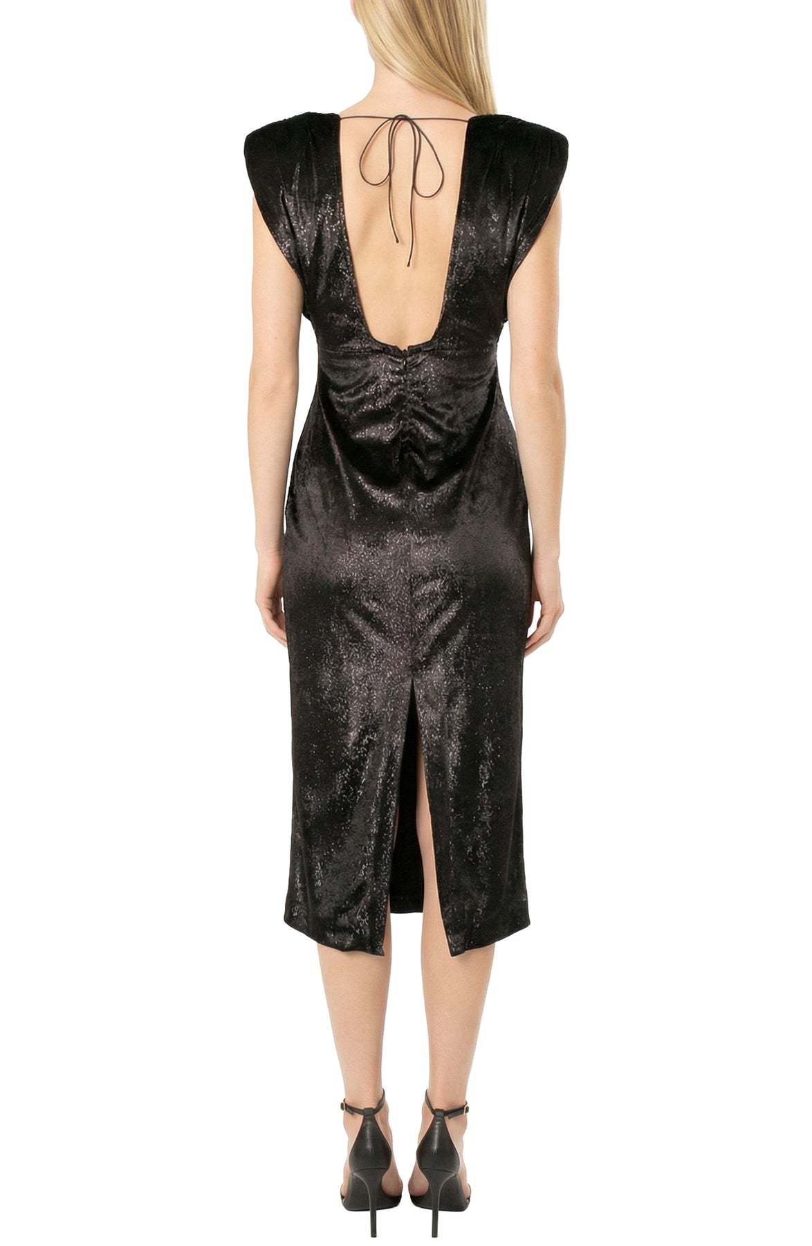 The Area Stars metallic velvet dress blends luxe shimmer with a sleek silhouette for standout style. Crafted from metallic velvet with a round neck, sleeveless extended shoulders, and a fitted bodycon shape, it features a back zip closure, tie at the neck, and vented back hem for polished movement. Designed to hit mid‑calf, it’s a statement piece that works beautifully for evening events or special occasions.